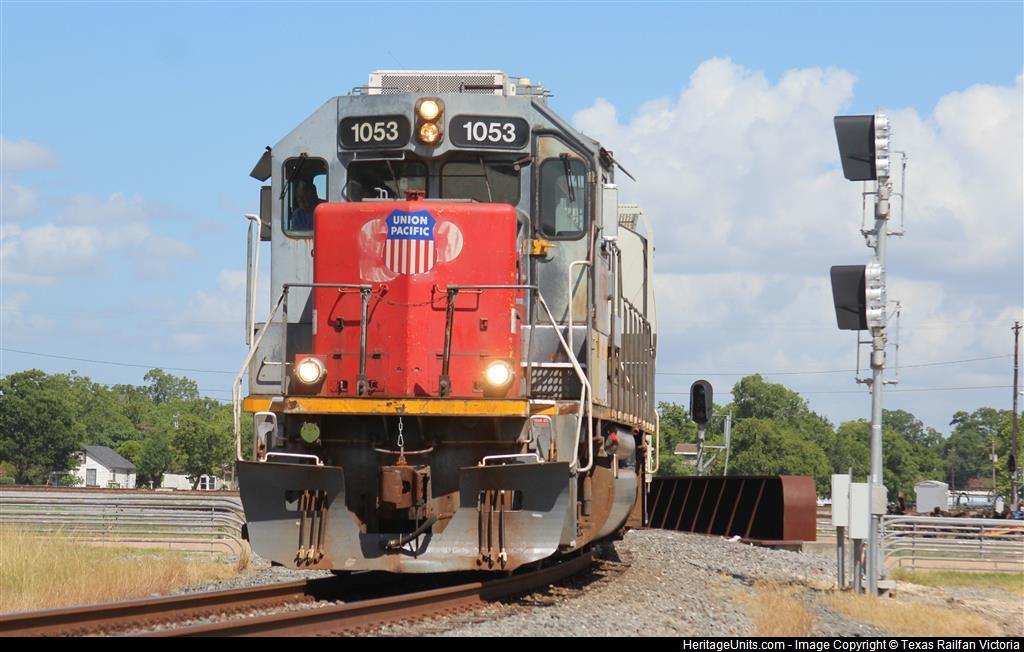 UP 1053 pulls a short LHC03 on to the Cuero Sub on the north leg of the wye.