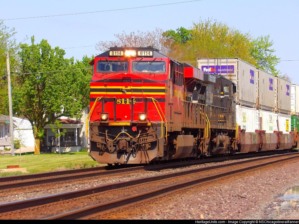 NS8114 is leading NS 29P in Kendallville, Indiana, on the NS Chicago line at MP379. He is gonna switch from track 1 to track 2.