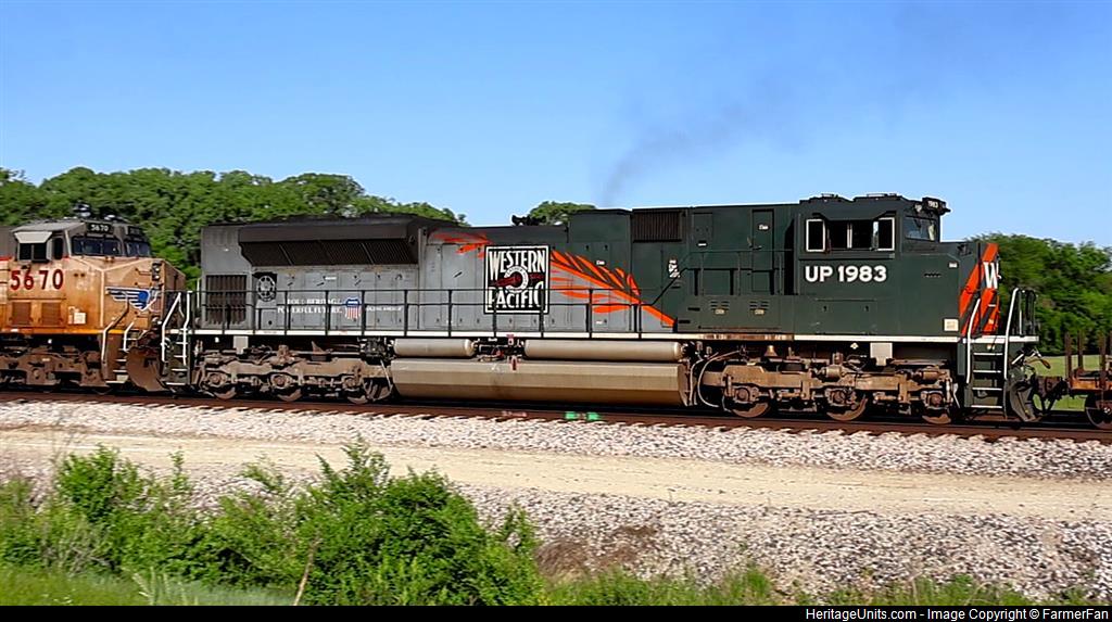 UP 1983 is 2nd of 2 mid-DPUs, facing back on UP ZLCG2 passing Medora siding. Looks really good in the evening light with the thick diesel smoke!