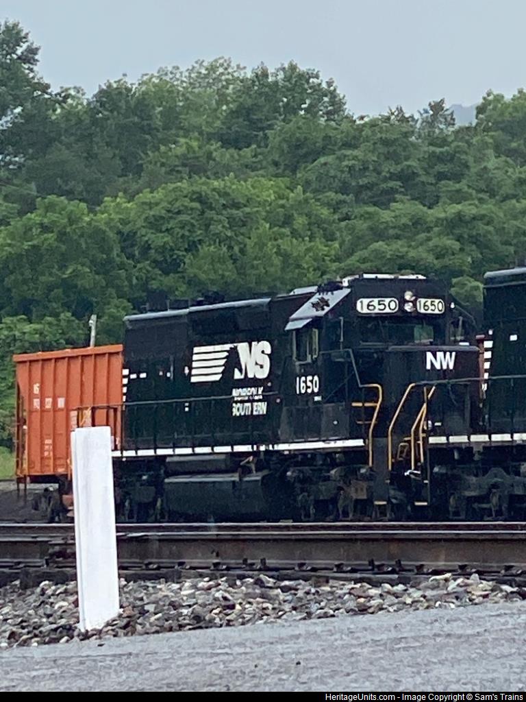 NS 1650, vandalized with a painted nose from its former road name, sits tied down in emory gap yard