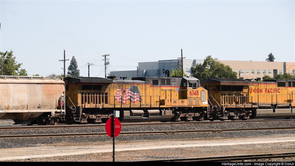 UP6748, with the John W. Givens plaque, is helping UP6889 bring a medium length mixed manifest into the J. R . Davis Yard.