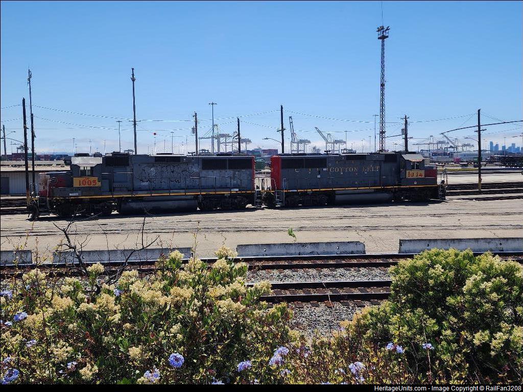UP 1004 and UP 1005 arrived UP Oakland. Still showing Cotton Belt and SSW script.