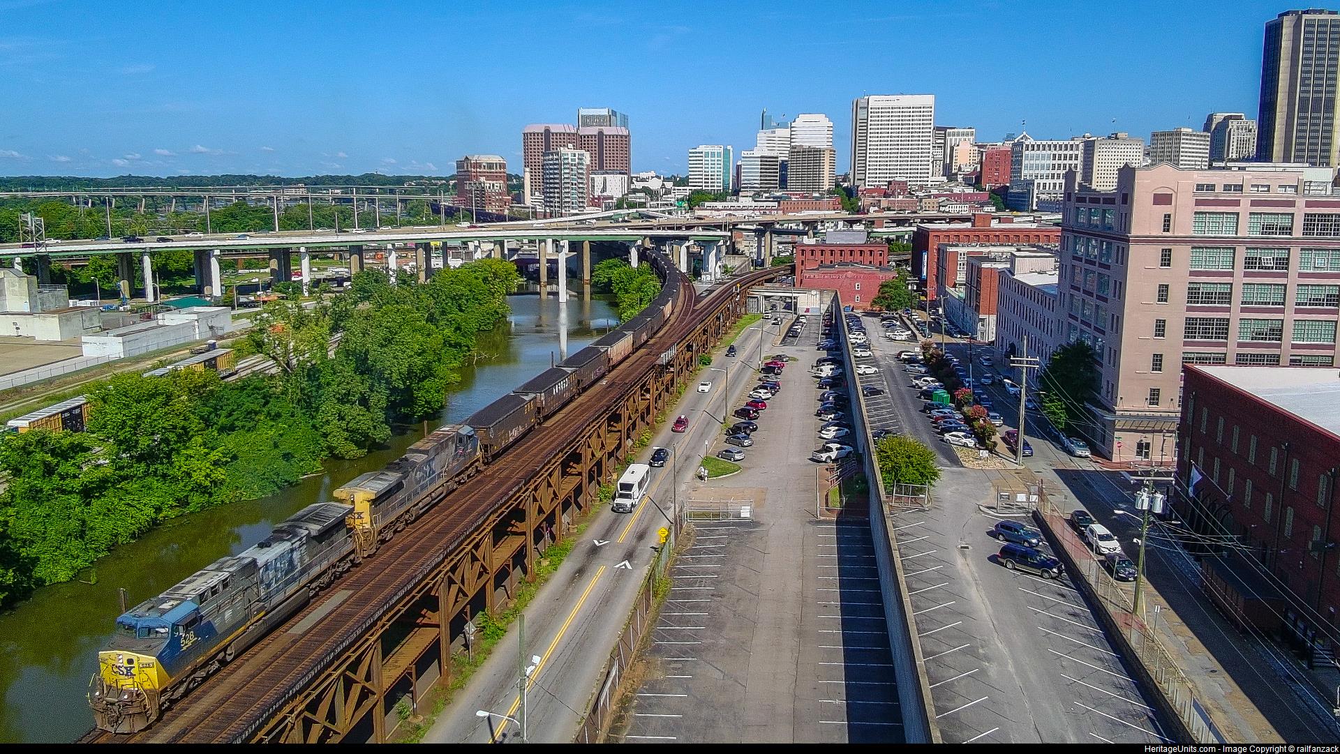 CSX 528 leads C206 as it pulls out of the city of Richmond.