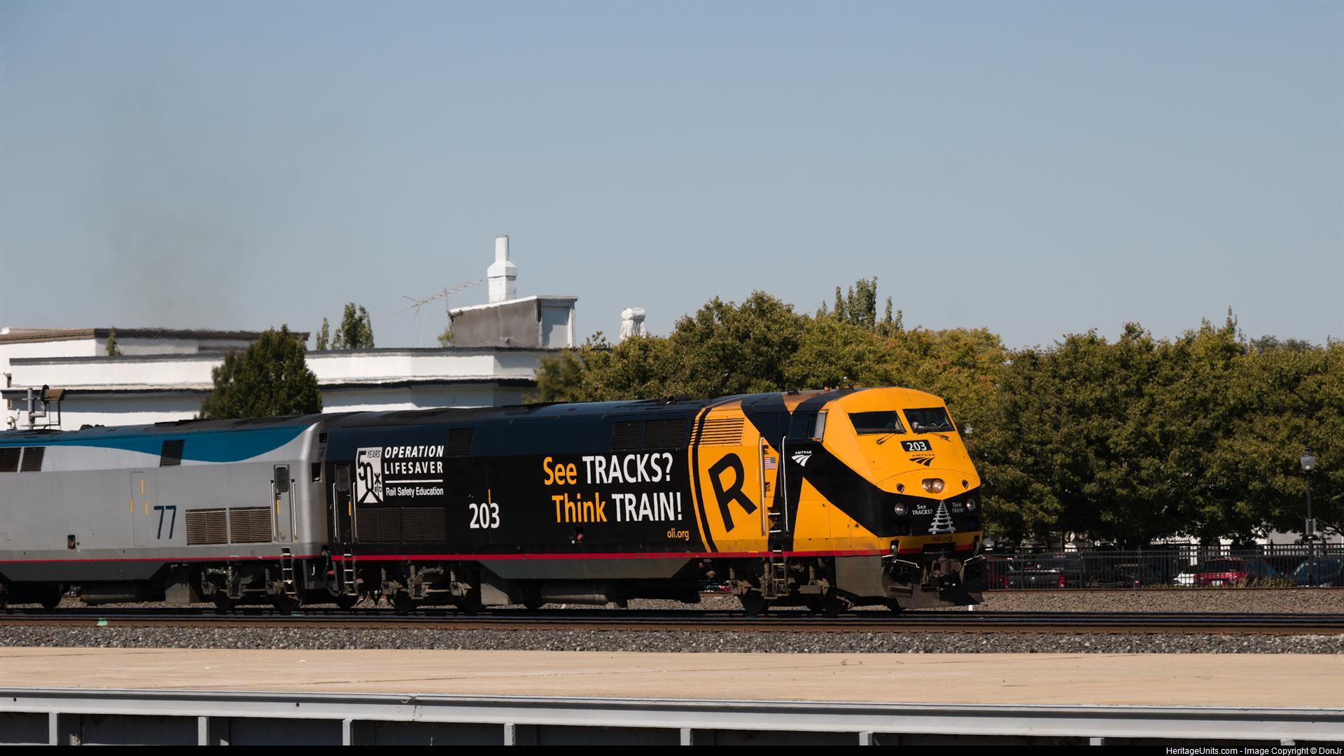 AMTK203 leads the way as California Zephyr number six pulls away from the platform at Roseville, California.