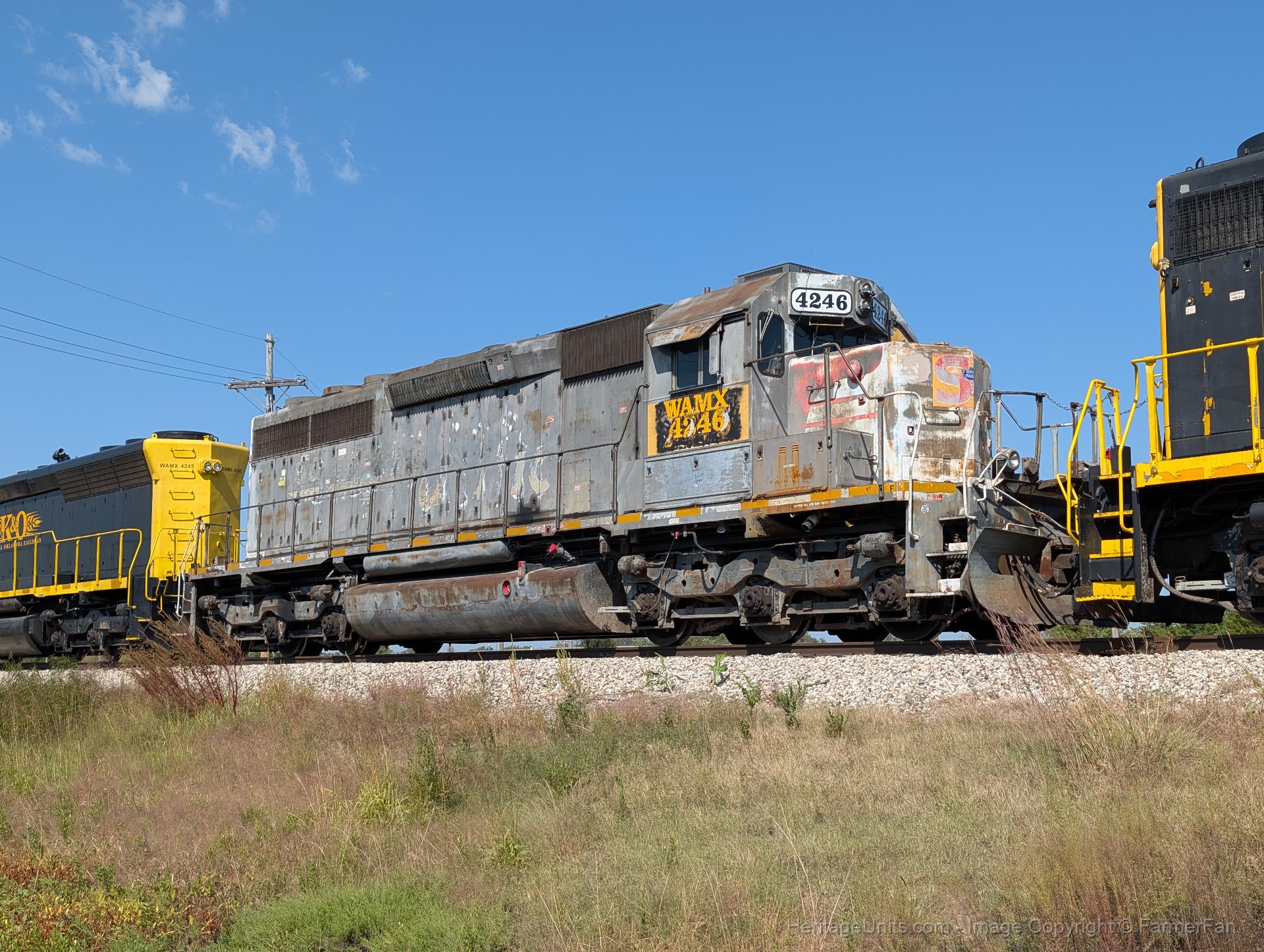 WAMX 4246 trails second out facing east on the Wichita to Yaggy train. Parked just east of the yard offices, powered off, on the main.