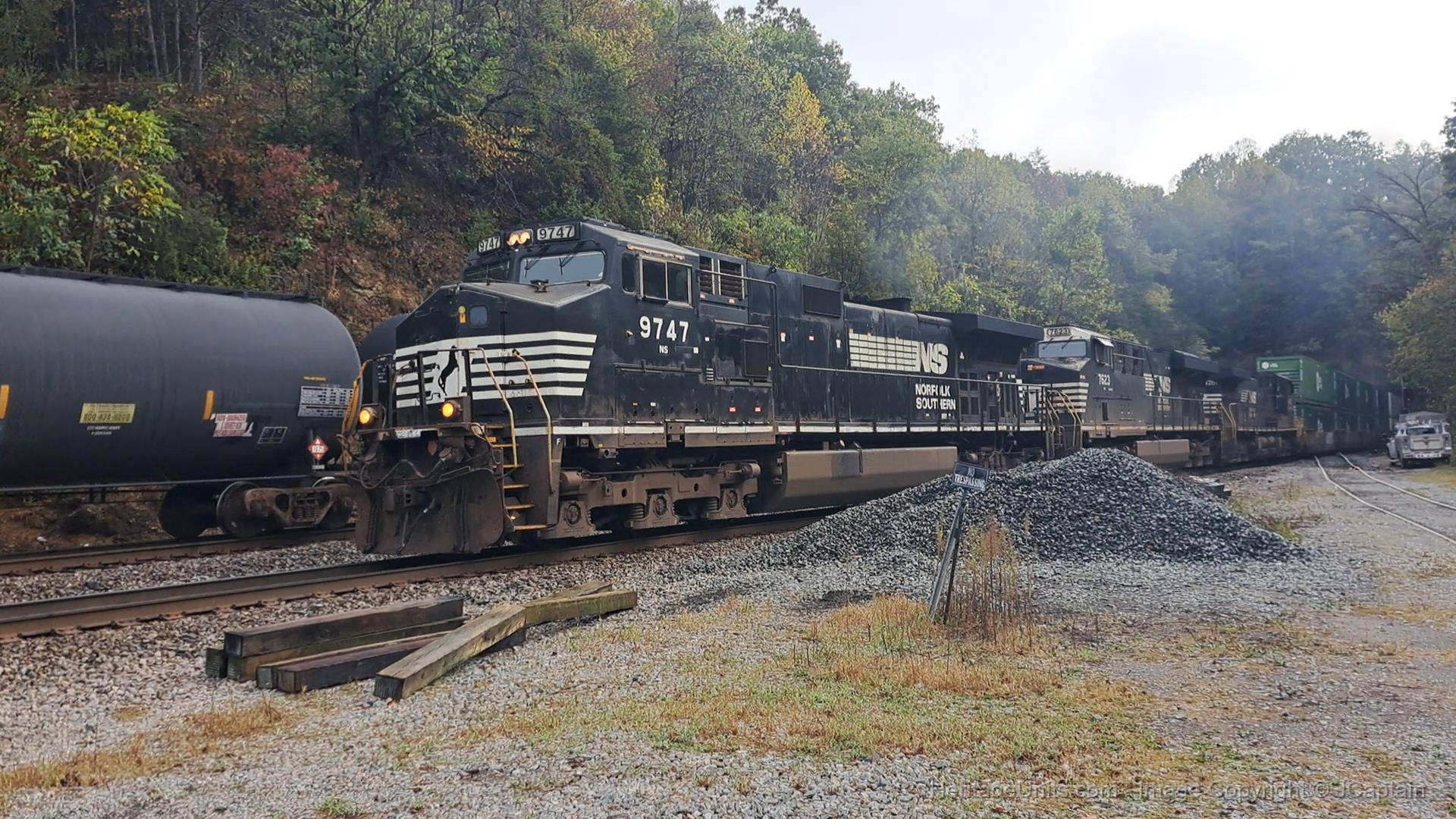 NS 9747 leads intermodal 29C out of Montgomery Tunnel, racing westbound manifest 11E