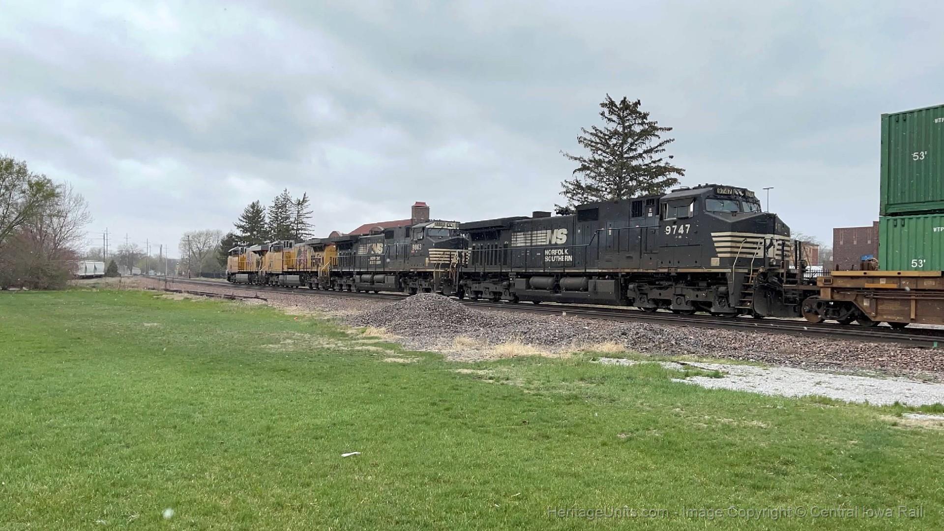NS 9747 trailing last on this westbound UP intermodal assuming ZG2LC. At the time of recording of this unit in 2023. I was not aware this unit will become the last thoroughbred C40-9W on NS as all of them had been rebuilt, repainted, or retired.
