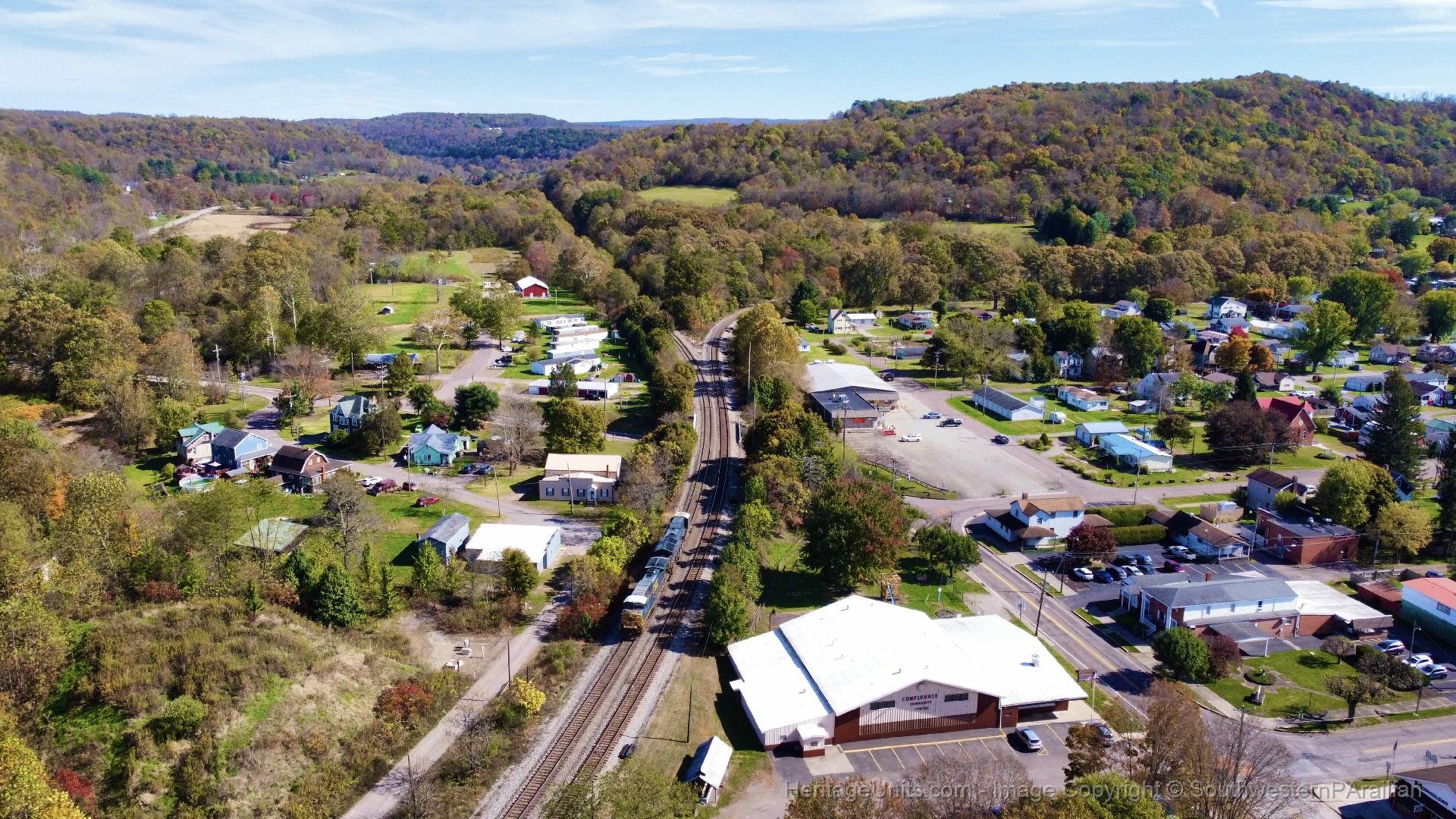 CSX 12 leads H168 down Sand Patch Grade through Confluence to help I136 up the grade east.