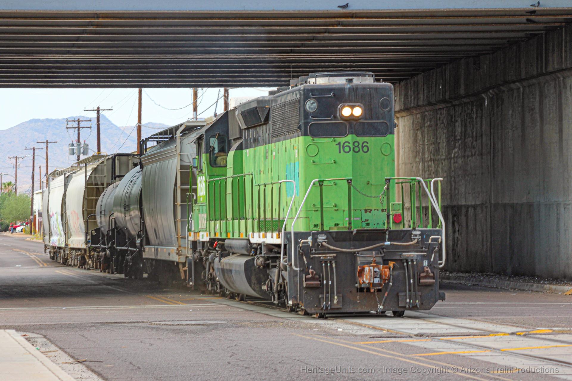 BNSF1686 begins the street run portion LHF on the Y-PHX1051-17I