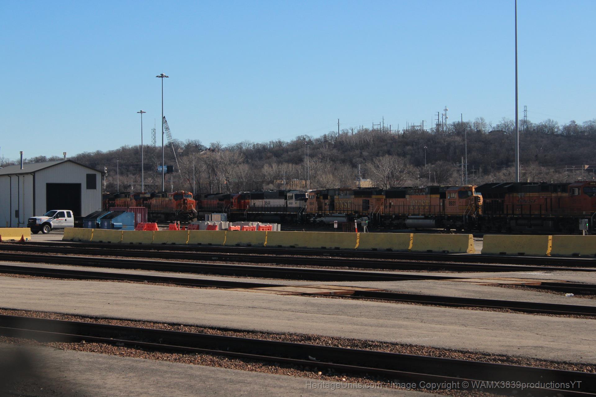 A trio of old and retired BNSF SD70MACs sits at BNSF Argentine Yard. 2 of the macs are in H2, and the third one is an Executive Mac. An H1 Dash 9 sits in the background paired with either an SD40 or a Geep. These SD70s are soon to be scrapped, so its cool that I got to see them before their unfortunate demise.