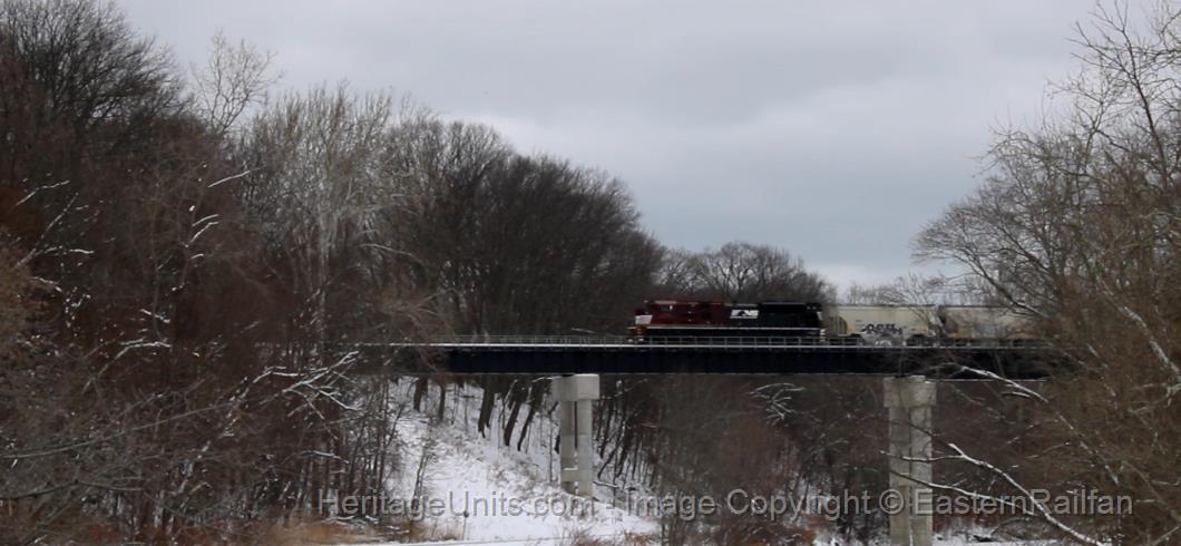Crawling over the bridge that covers the former B&LE with a decent hornshow.