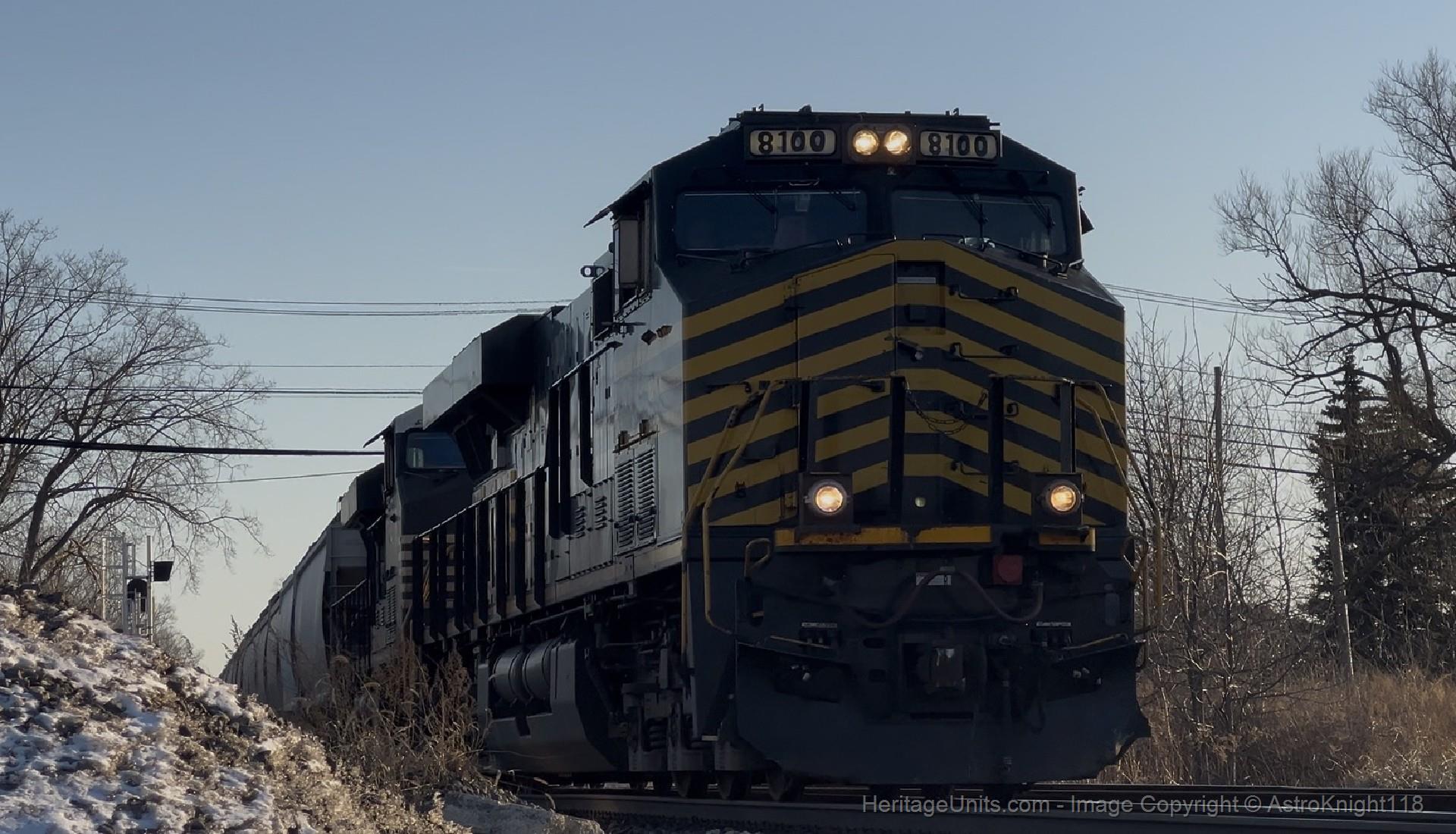 NS 8100 glides through Blasdell, headed for Track 2 as 315 is on 1.