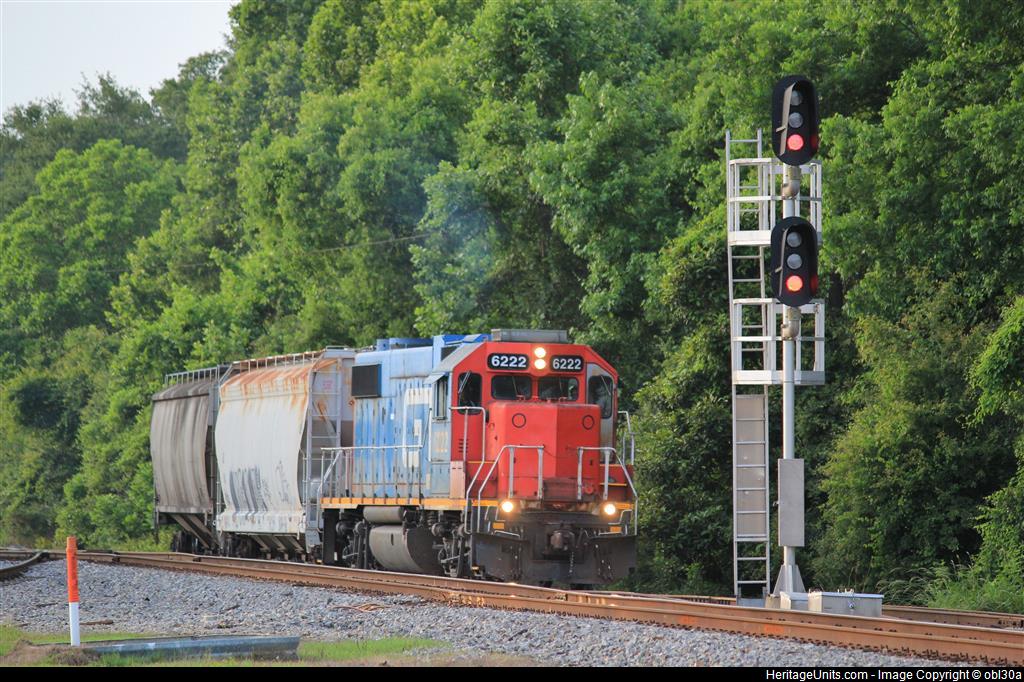 L574’s GTW GP38-2 6222 leads a pair of covered hoppers onto the east branch of the junction.