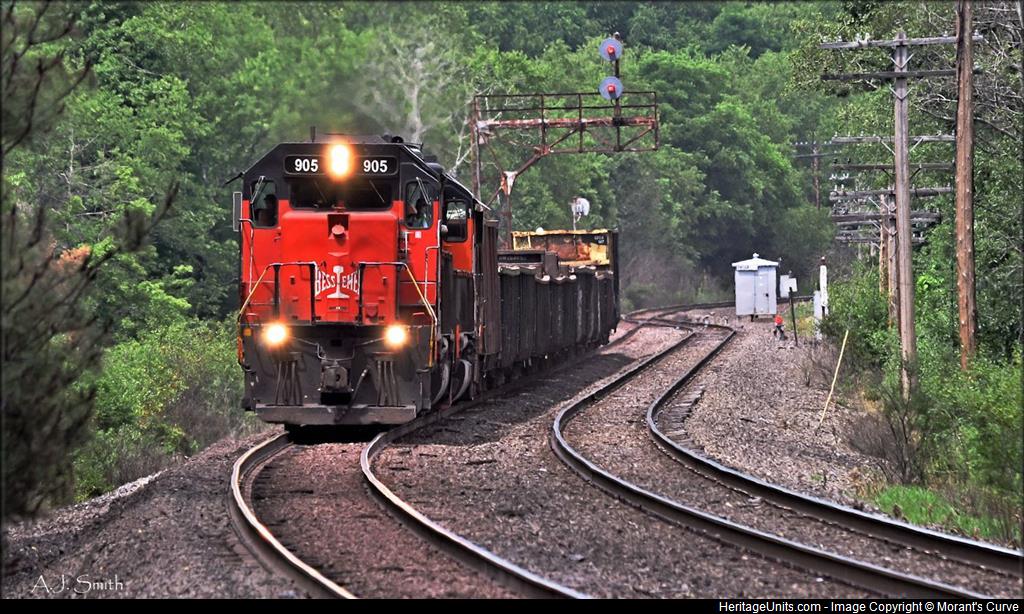 The southbound AK Steel train approaches the outskirts of Butler, Pennsylvania. Now assimilated into the Canadian National Railway, this line used to be part of the Bessemer & Lake Erie and just a handful of B&LE painted locomotives remain on the property. On this day: a truly rare lash-up of two former Bessemer units still in orange.