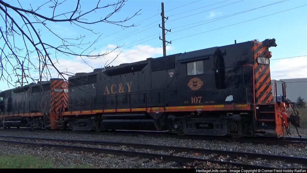 W&LE Akron, Canton & Youngstown GP35 107 leads W&LE Pittsburgh & West Virginia GP35 101 south in Glenwillow to pick up cars from the Glenwillow siding at 9:57 a.m.
