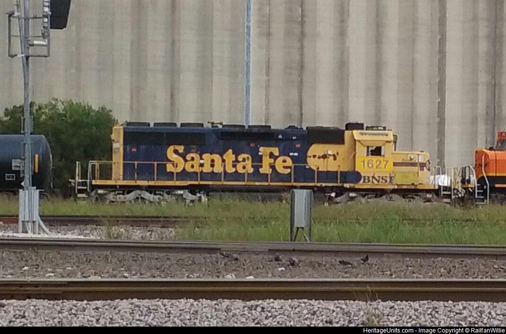 ATSF 1627 trails as the 3rd unit on a BNSF transfer heading to Blue Mound.