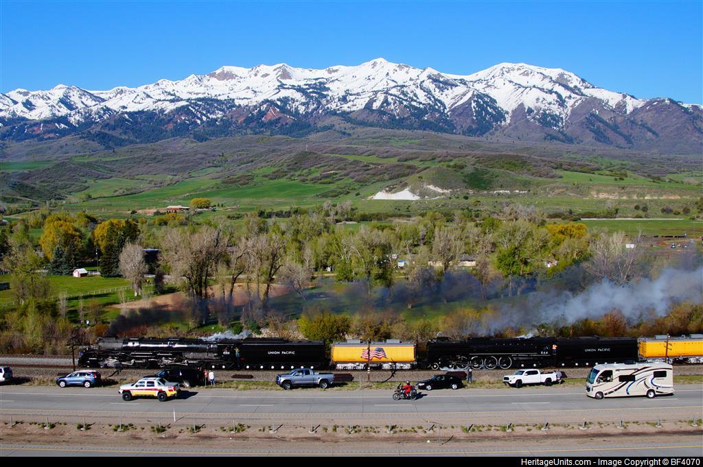 Union Pacific #4014 and #844 head back East to Cheyenne, WY from Ogden, UT with the Golden Spike 150th anniversary train. Here the train is at Mountain Green, UT at 10:47 am along Interstate 84.