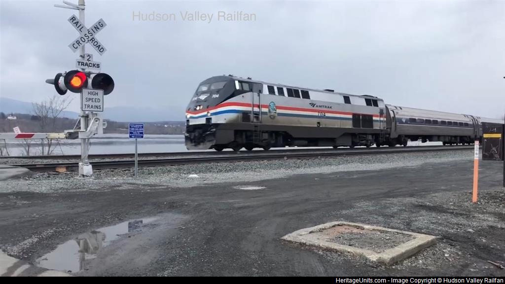 Amtrak 704 rushing down the Hudson River at Tivoli