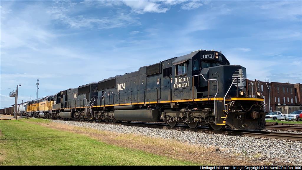 IC 1024 and IC 1003 lead CN A407 out of Centralia, IL with two ex-UP GP38-3’s in tow.