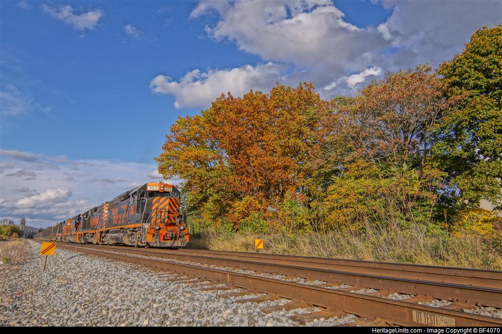 W&LE #302 GP40-3 is shoving East on #2 track on the CSX New Castle Sub at MP BG130.9 at 4:57 pm. This is empty stone train Z642-23. Train will shove to BD interlocking then cross over to #1 track to MP BG128.9, which is the W&LE connection.