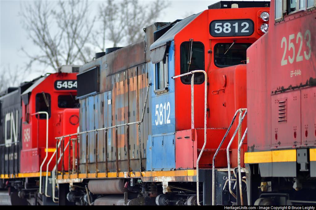 A weathered veteran of over 40 years service, GTW5812, sits fourth among five units heading a southbound manifest freight through suburban Chicago.