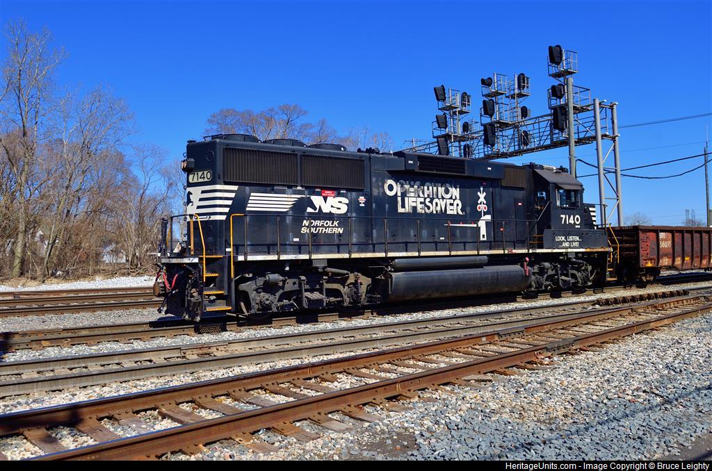 With long nose/hood forward, NS7140 leads the "bottle train" through the southeastern suburbs of Chicago. The NS hot metal or "bottle train" consist includes special cars which carry molten iron from blast furnaces in East Chicago to a steel-making plant in Riverdale, Illinois which is just west of the Dolton diamond.
