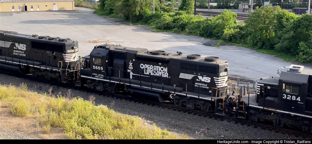 NS 5669 trails a manifest rolling by the Amtrak station