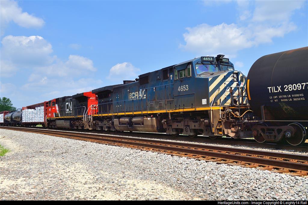 One of two mid-train DPUs on a CN manifest freight moving through Sutton Siding.