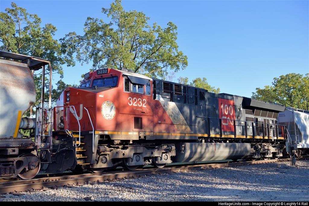 Acting as a DPU on a southbound manifest, CN3232 moves through Spaulding Junction and the dappled sunlight of late afternoon.