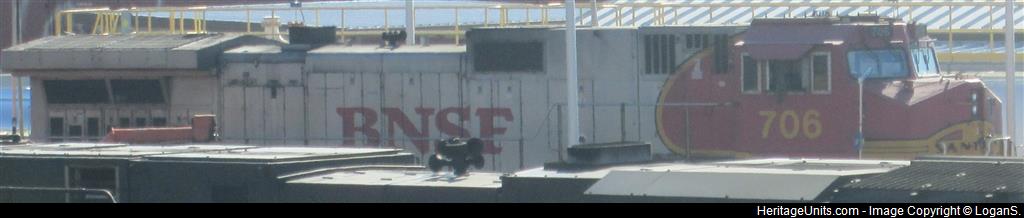 Cropped pic of BNSF 706. The nose clearly says Santa Fe however this locomotive was delivered to BNSF. Only the early 7XX BNSF Warbonnets have the Santa Fe lettering on the nose. Later ones have normal BNSF lettering. The Santa Fe lettering is odd though because Santa Fe (ATSF) never owned these locomotives.