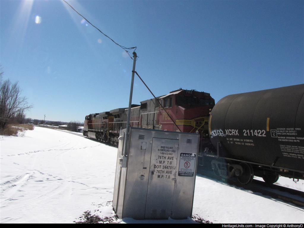 After sitting up by W.80th Ave by MP 7.5 for about 2 hours and half and crew change. BNSF C44-9W #4189 & BNSF Warbonnet C44-9W #782 & with a good horn show and friendly wave from the conductor lead the southbound H-LAUDEN manifest freight train passed M.P. 7.0 on the BNSF Front Range Subdivision with BNSF C44-9W #4637 as the rear DPU.