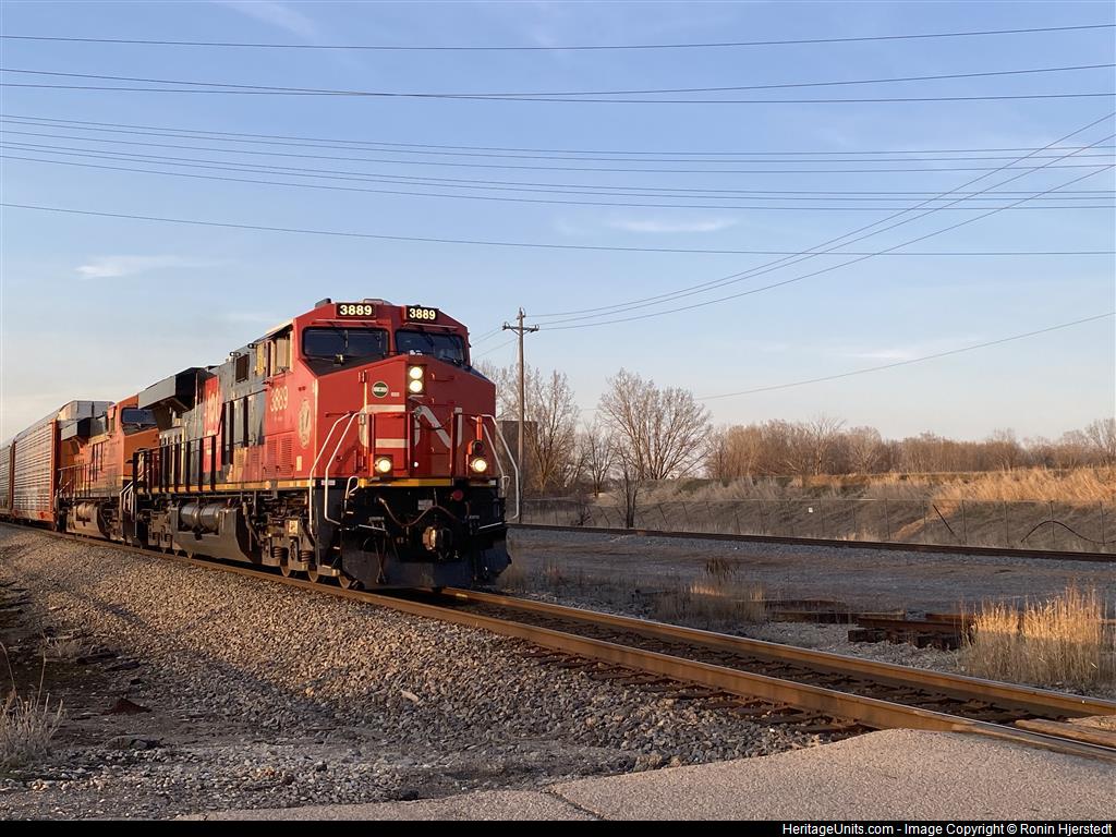 BNSF 7587 trailing. Autorack train with CN 3889 100 unit leading