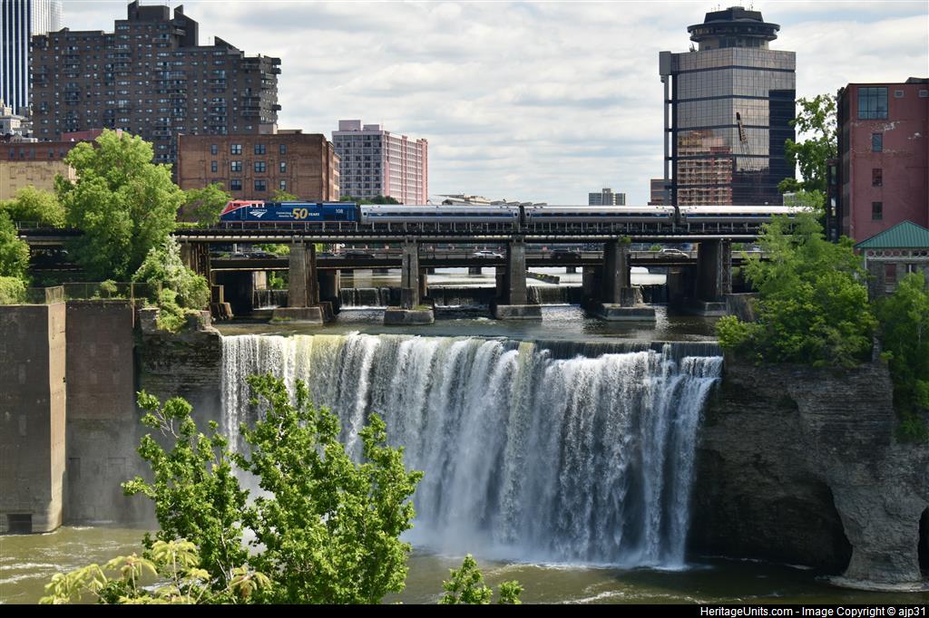 50th Anniversary P42 108 leads train 64 east over High Falls in Rochester, NY.