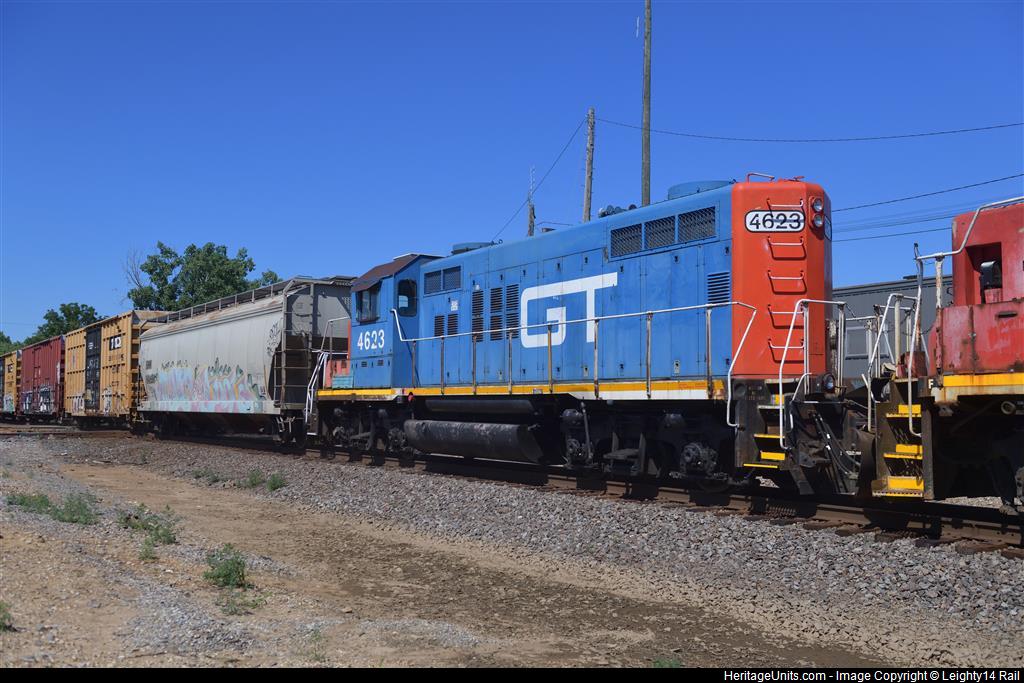 One of three units in original GTW paint at head end of a manifest freight eastbound through Spaulding Junction.