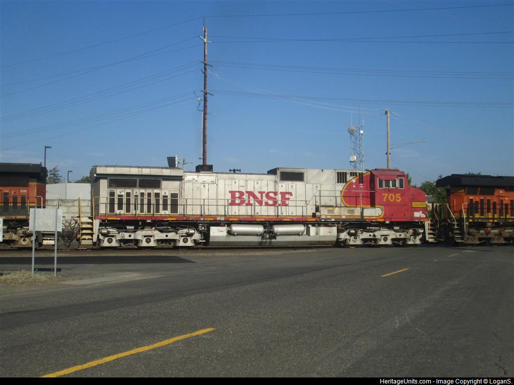 BNSF 705 2nd on a mad H-TACPAS. BNSF ES44C4 6522 leading, Warbonnet 705 2nd, H1 1083 3rd, GP60M-3 128 4th & GP39-3 2516 5th (rebuilt from a GP30) Apparently it was stopped here for a long time so I managed to just randomly find it. Thought it was long gone when I came.