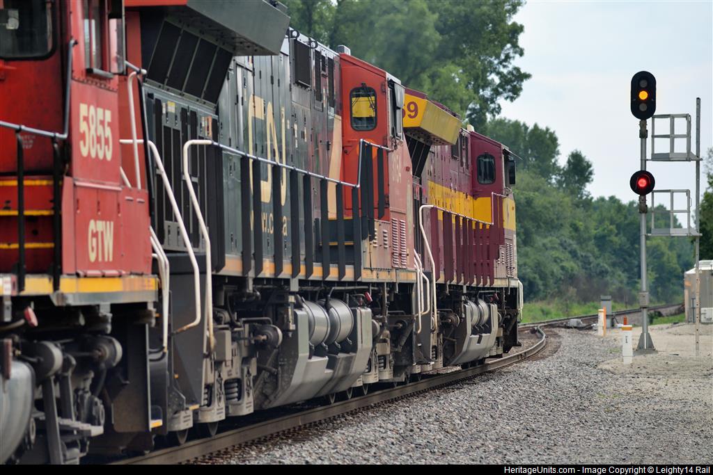 CN3069 on the point as it leads a manifest out of Sutton Siding under a yellow signal and onto the main eastbound on the Leithton Sub.