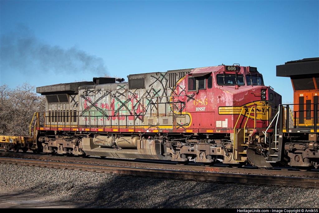 BNSF 686 works with another locomotive to pull a train of empty flat cars east. Over the years, this engines has certainly attracted several graffiti artists turning it into the very unique looking unit it is today!