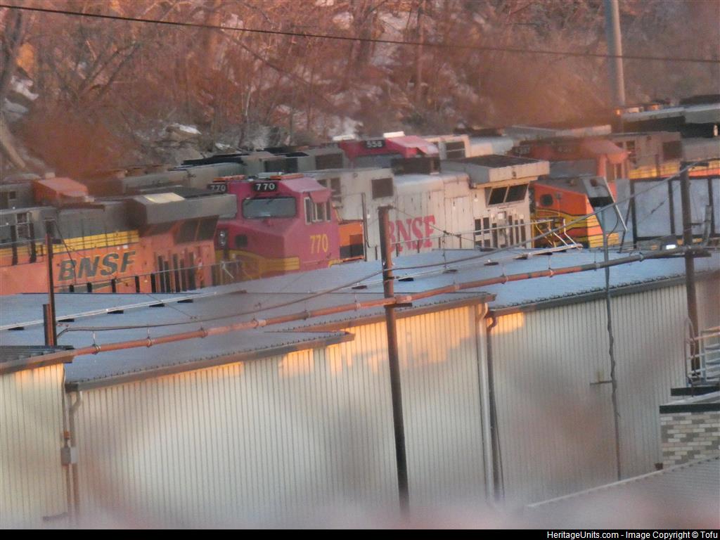 BNSF 770 sits in the engine lines behind the Northtown Shops awaiting service or a new task. The top part of the cab and number boards of BNSF 558 can be seen right behind 770. Photo was taken with 2 fences in the way.