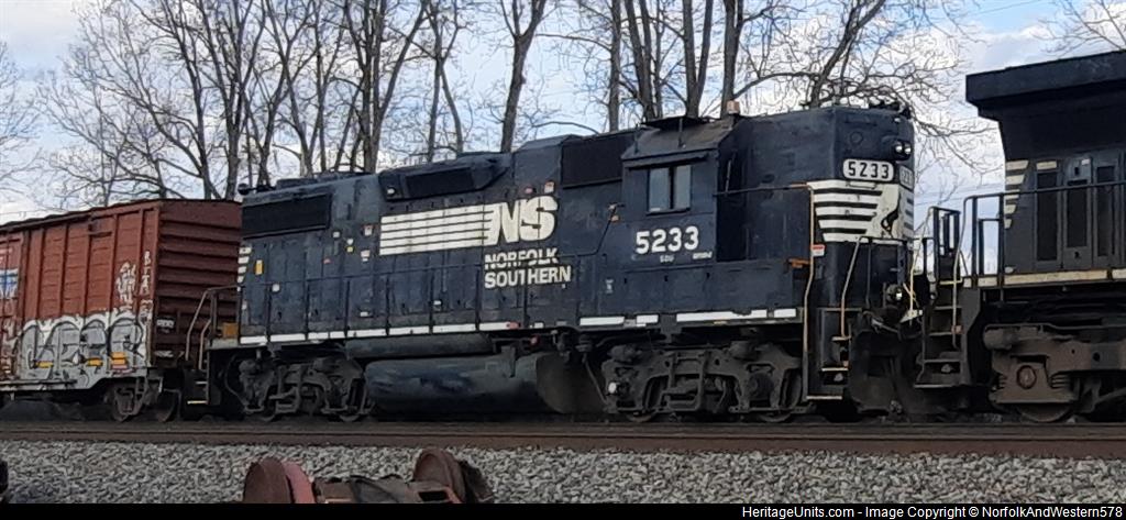 NS 5233 (Ex'SOU GP38-2 High Hood) trailing 2nd on NS 171, passing the Ohio Railway Museum looking nice.