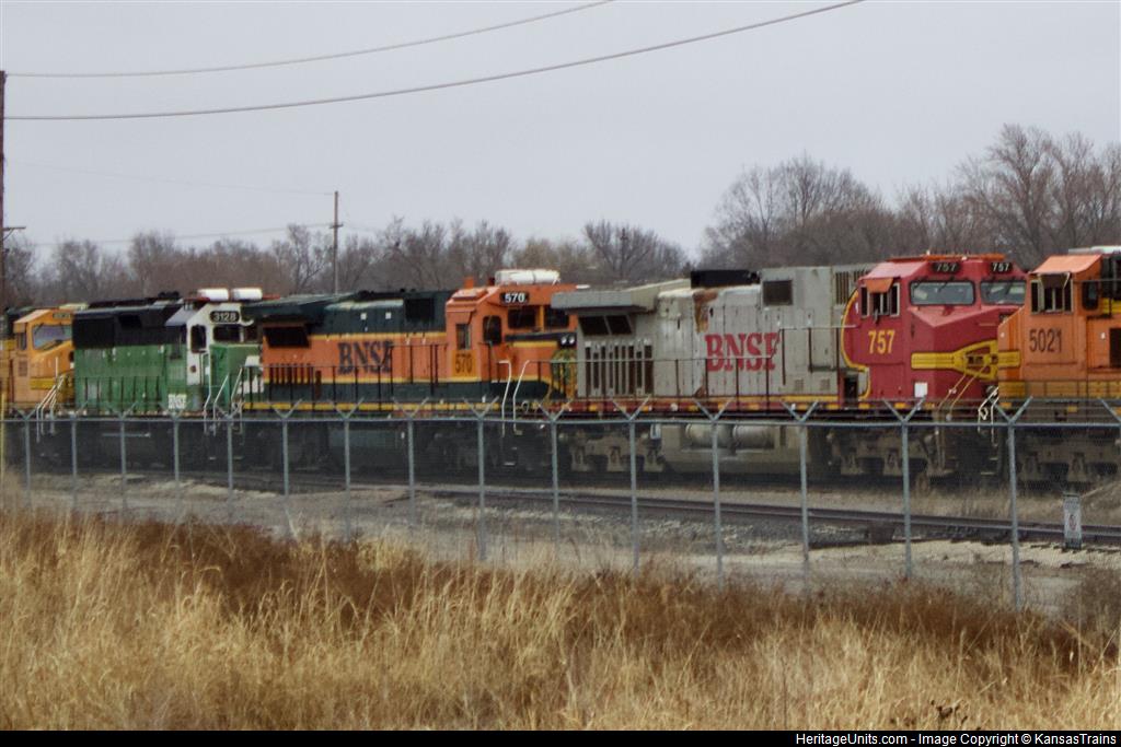 BNSF757 seen sitting in the Topeka Deadline next to BNSF570 (GE B40-8) and BNSF5021. BNSF3128 is also seen behind 570 on a cloudy Kansas day.