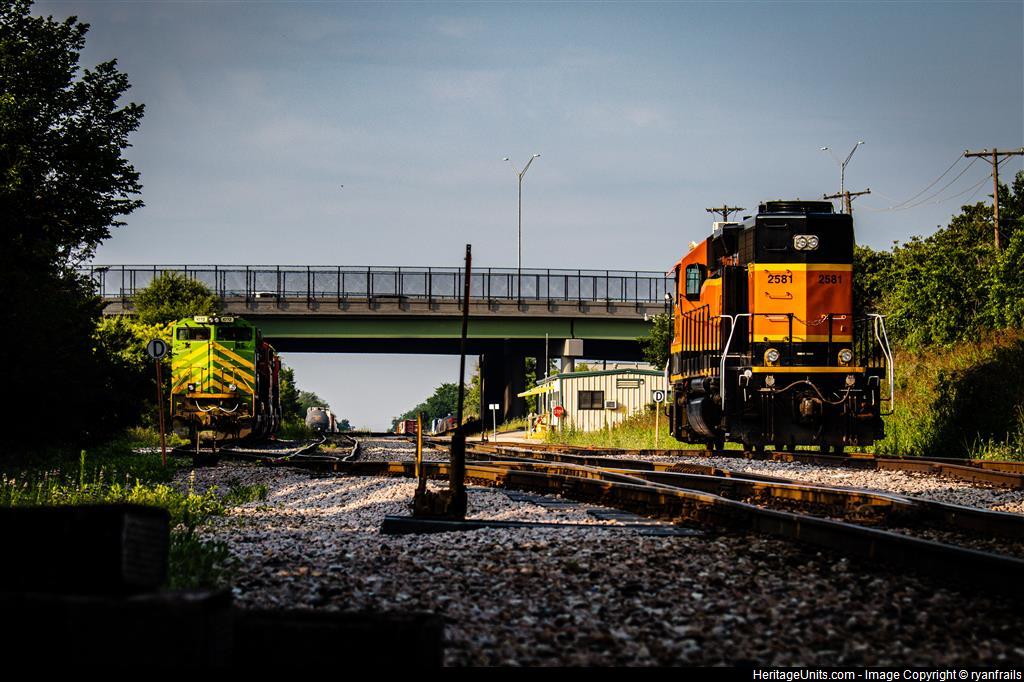 Illinois Terminal with 3 BNSF GE’s awaiting its assignment to M IRBTUL as a BNSF GP39-3 sits alone also awaiting an assignment