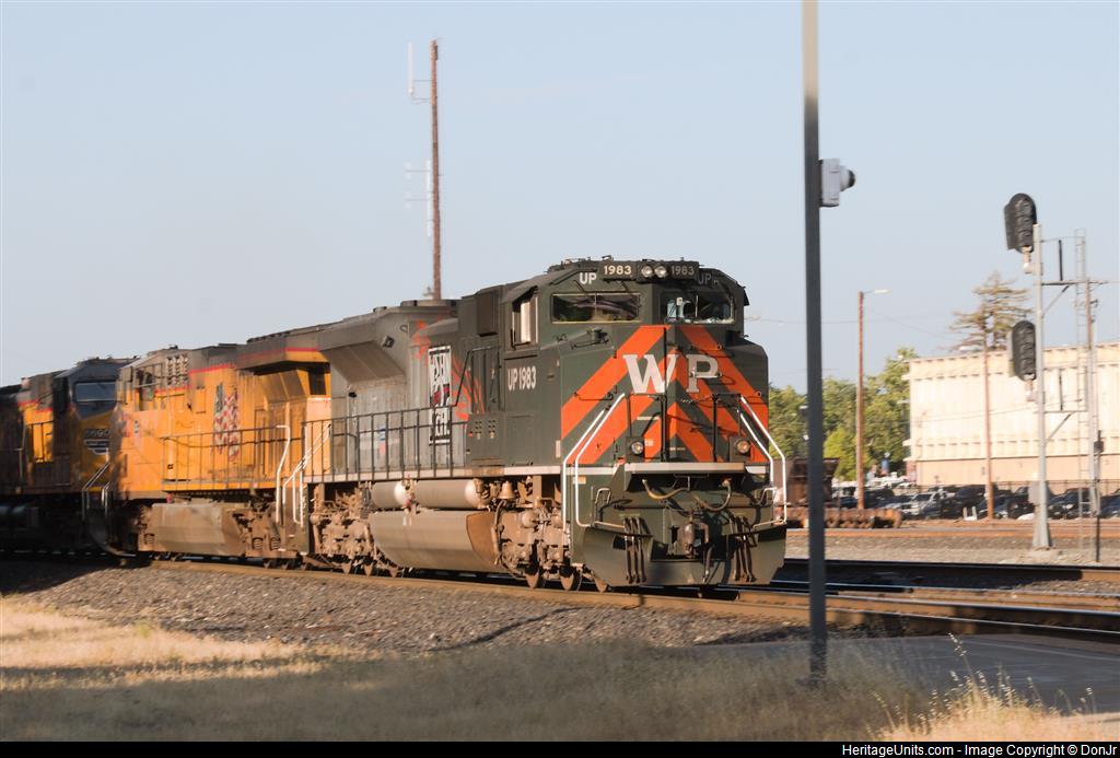 UP1983 has just finished its trip around the wye and is leading this light power move westbound on main track one in the J. R. Davis Yard.