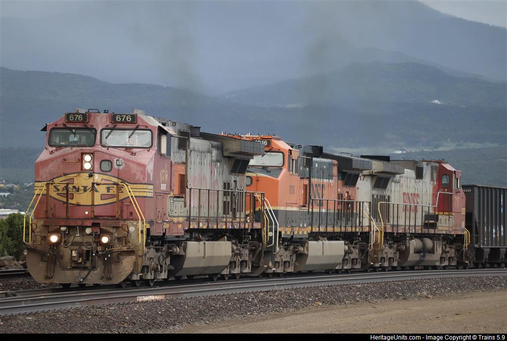 BNSF 676, along with an H1 Dash-9 and another BNSF Warbonnet, lead the HCLODEN north out of Trinidad, Colorado.