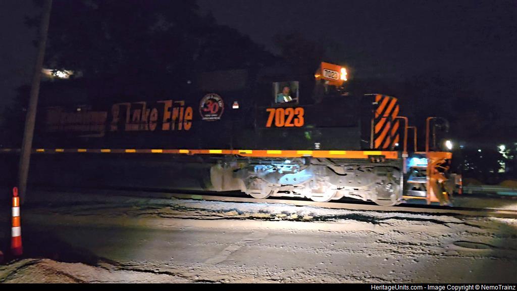 Wheeling & Lake Erie 30th anniversary unit 7023 leading train 711 westbound through Medina.