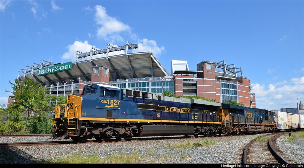 CSX's Baltimore & Ohio Heritage ES44AH-1827 is leading W/B Intermodal train I-031 (North Bergen, NJ to Jacksonville, FL). Here, passing the NFL's Baltimore Ravens M&T Bank Stadium on CSX's Baltimore Terminal Sub. Track on the right is the east leg of the wye from the main to the Locust Point Branch. Tracks behind 1827 are the MARC commuter train leads to Camden Station.