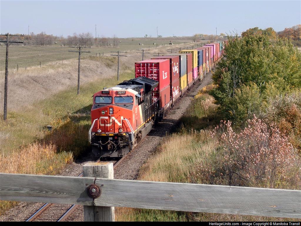 CN 3217 on Train 106 heading east on the Rivers Sub at Mile 181.