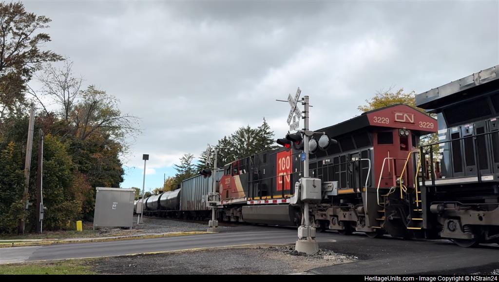 CN 3229 trails 2nd on NS 6K4 which can be seen highballing through Main St in Vermilion, OH on the NS Chicago Line on track 2. 10/22/23