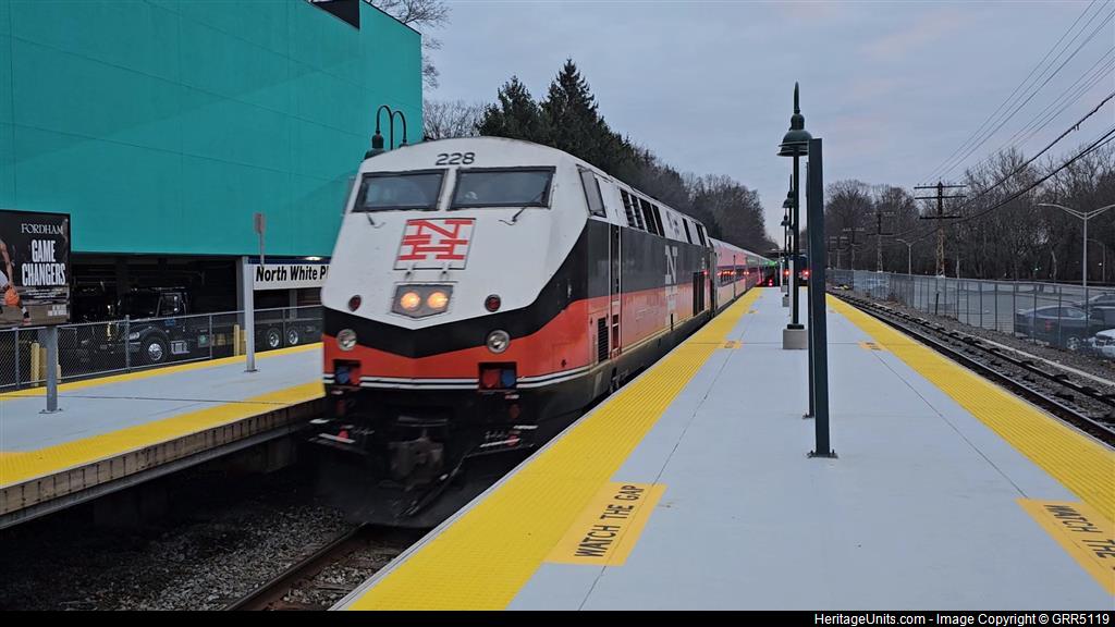 MNCR 228 leads Harlem Line Train 943 into North White Plains Station about 2 minutes late.