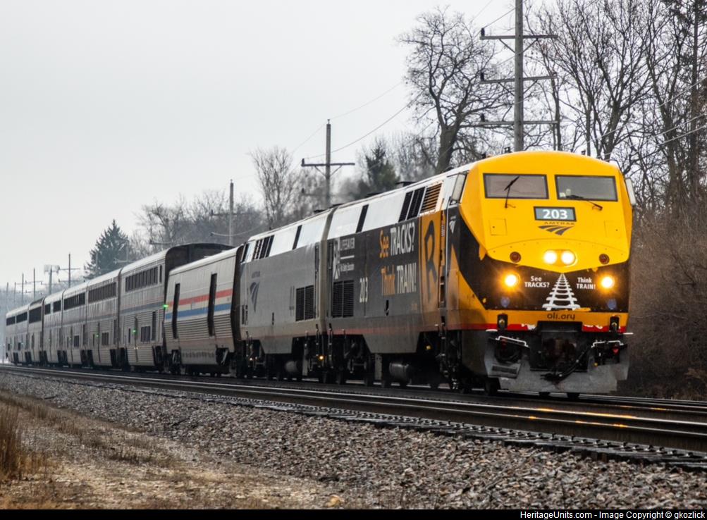 Under gray skies and drizzling rain, Amtrak 203 leads the westbound Southwest Chief. They’re approaching the Belmont Metra platforms in Downers Grove on the way to their first stop in Naperville. December 22, 2023.