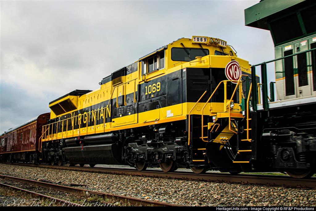 NS SD70ACe #1069, the Virginian Railway Heritage Unit, trailing on Empty OCS 955 through Marshall, VA.